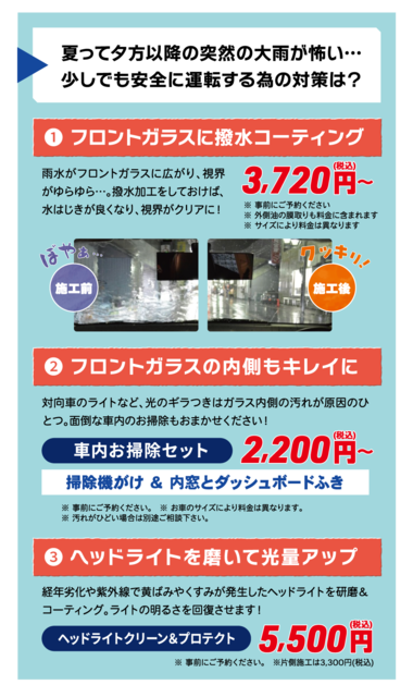 猛暑、ゲリラ豪雨、長距離運転など、なにかとトラブルやお困りごとが多い季節でもあります…。